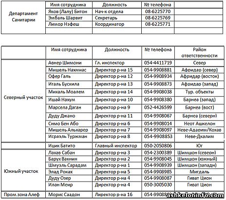 Город будет разделен на две части - Север и Юг с двумя инспекторами во главе. В их подчинении будут работать 10 руководителей секторов (Неот Ашкелон, Неве Адарим, Неве Декалим, Барнеа Маарав, Барнеа Мизрах, Барнеа Цафон, Афридар Маарав, Афридар Мизрах, Таярут (Марина, пляжи и т.д. и Афридар Цафон), плюс 6 исполнительных директоров южного сектора (Шимшон Маарав, Шимшон Даром, Шимшон Цафон, Гиват Цион, Мигдаль и промышленные зоны).