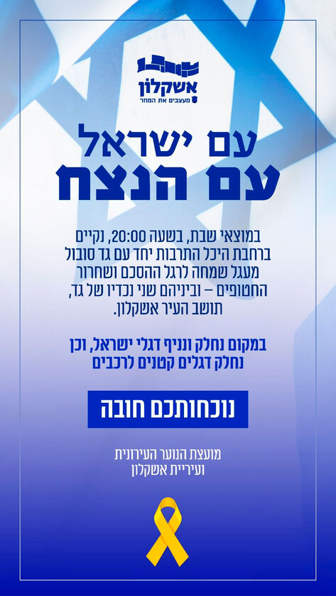 Муниципалитет Ашкелона совместно с Муниципальным советом по делам молодёжи проведёт завтра, в субботу вечером, в 20:00, радостный митинг на площади Гейхал ха-Тарбут в честь достижения соглашения и освобождения 48 похищенных.