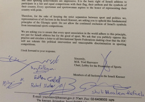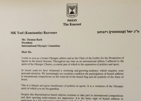 Председатель парламентского Лобби по вопросам спорта, депутат Кнессета Константин Развозов («Еш Атид»), во время своего визита на олимпиаду в Рио де-Жанейро, передал официальное письмо главе Международного Олимпийского Комитета (МОК) Томасу Баху. Письмо, подписанное представителями всех фракций Кнессета, призывает Баха противостоять запрету со стороны некоторых стран, по отношению к израильтянам выступать под государственным флагом во время международных спортивных соревнований.