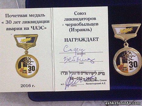 Медаль за помощь в лоббировании интересов Ликвидаторов Чернобыльской аварии в Кнессете.