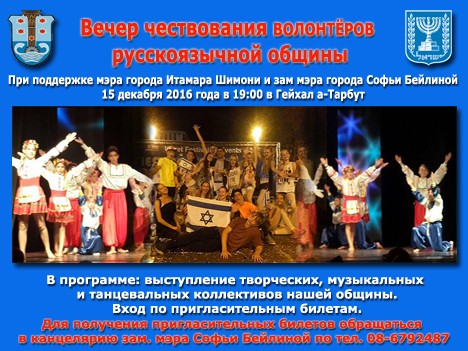 Для получения пригласительных билетов обращаться в канцелярию зам. мэра Софьи Бейлиной по тел. 08-6792487