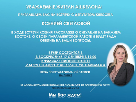 В ходе встречи Ксения расскажет о ситуации на Ближнем Востоке, о своей парламентской работе и будет рада ответить на ваши вопросы.
